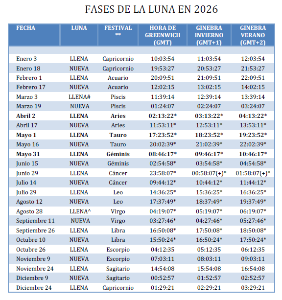 Calendario de las fases de las lunas llena y nueva para todo el año.